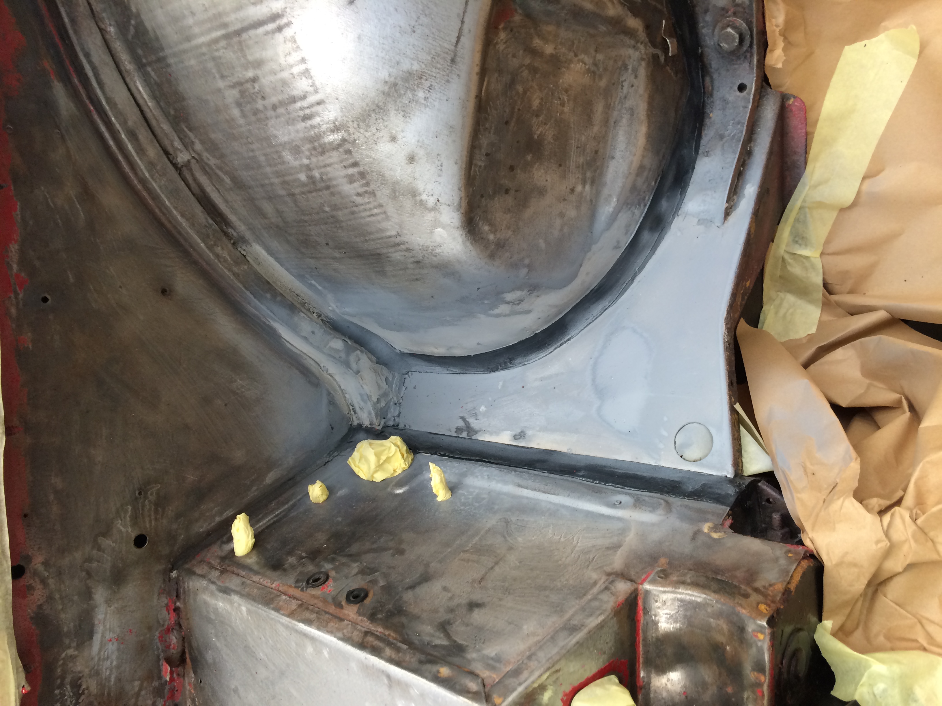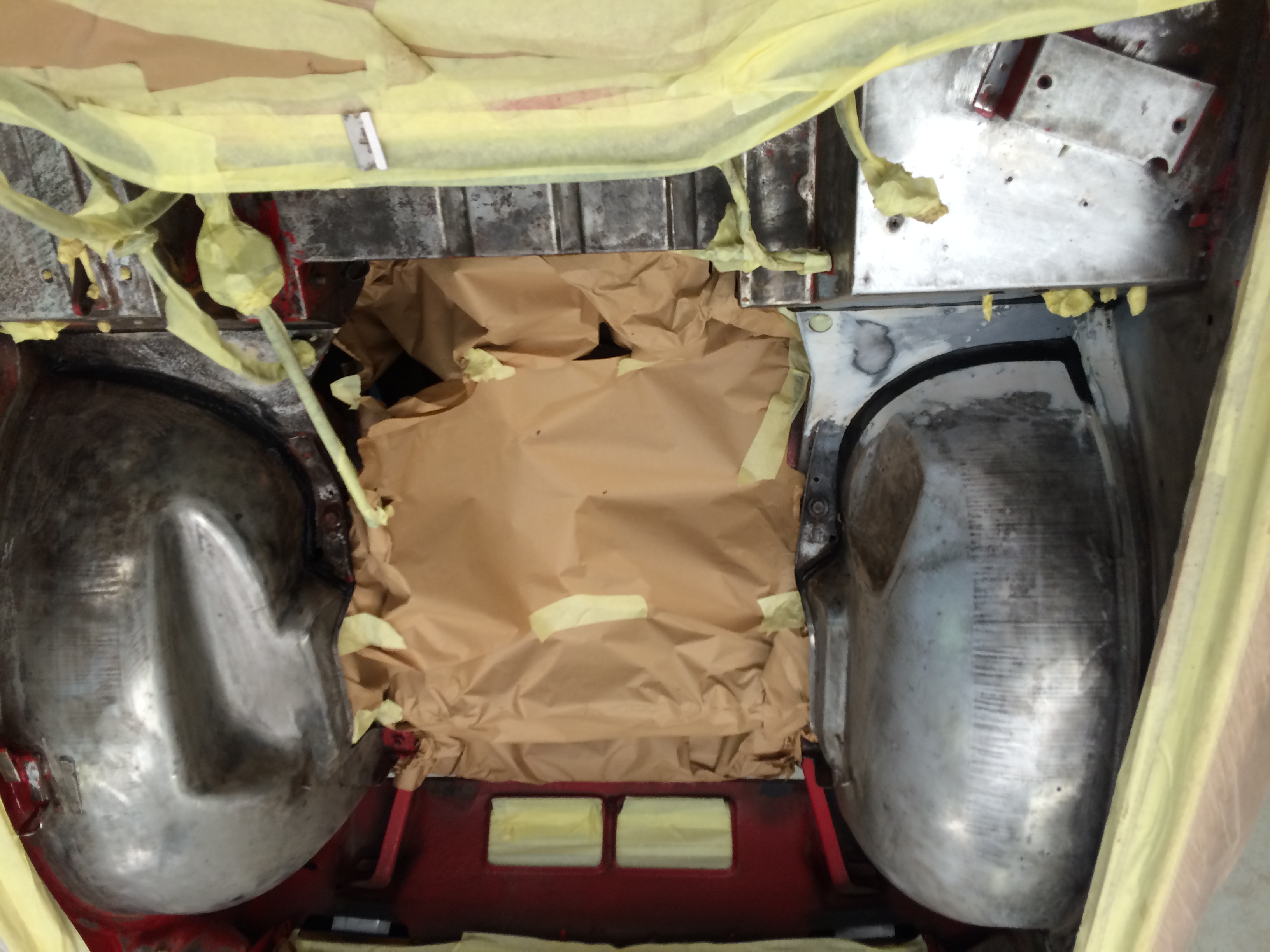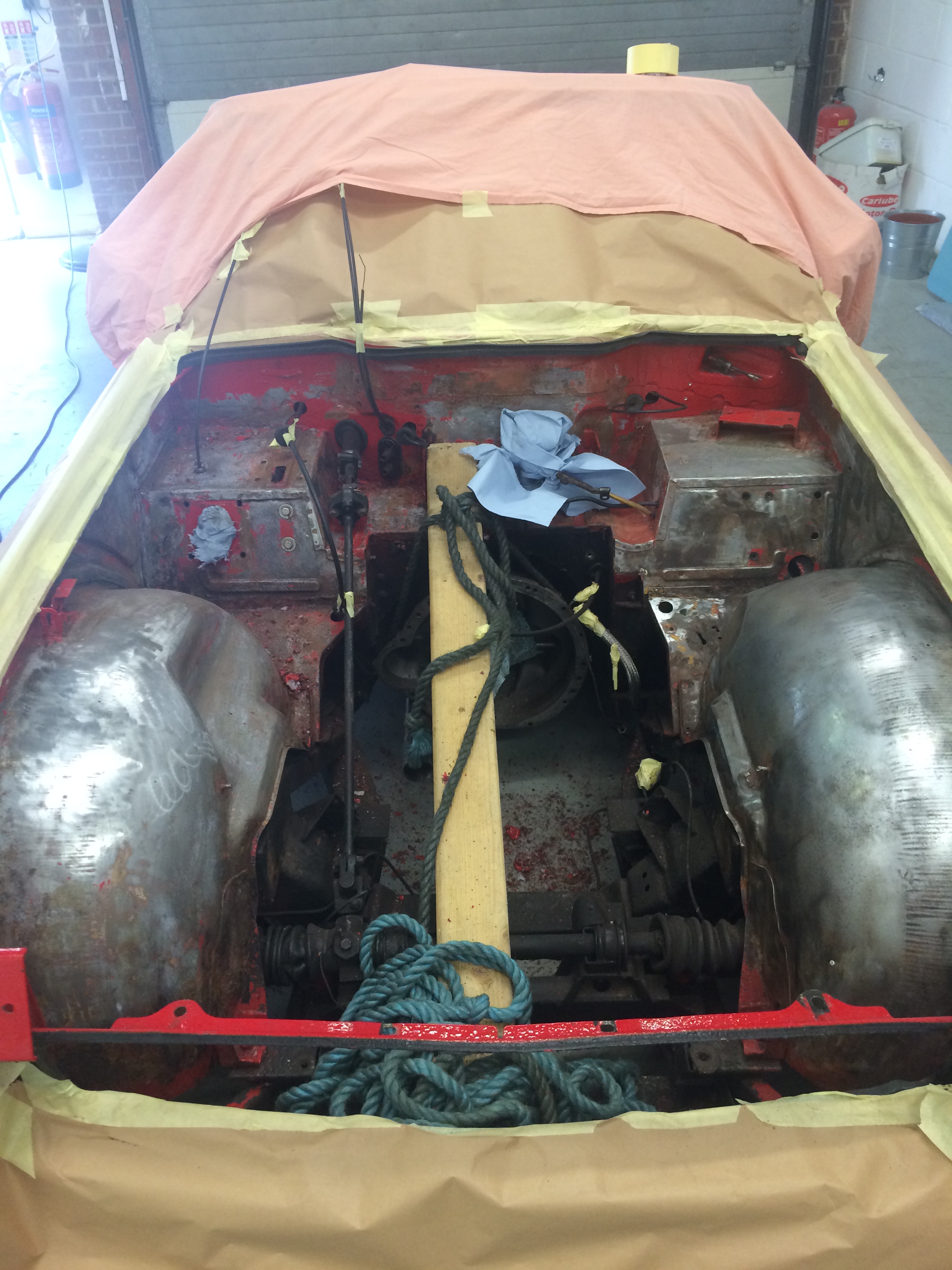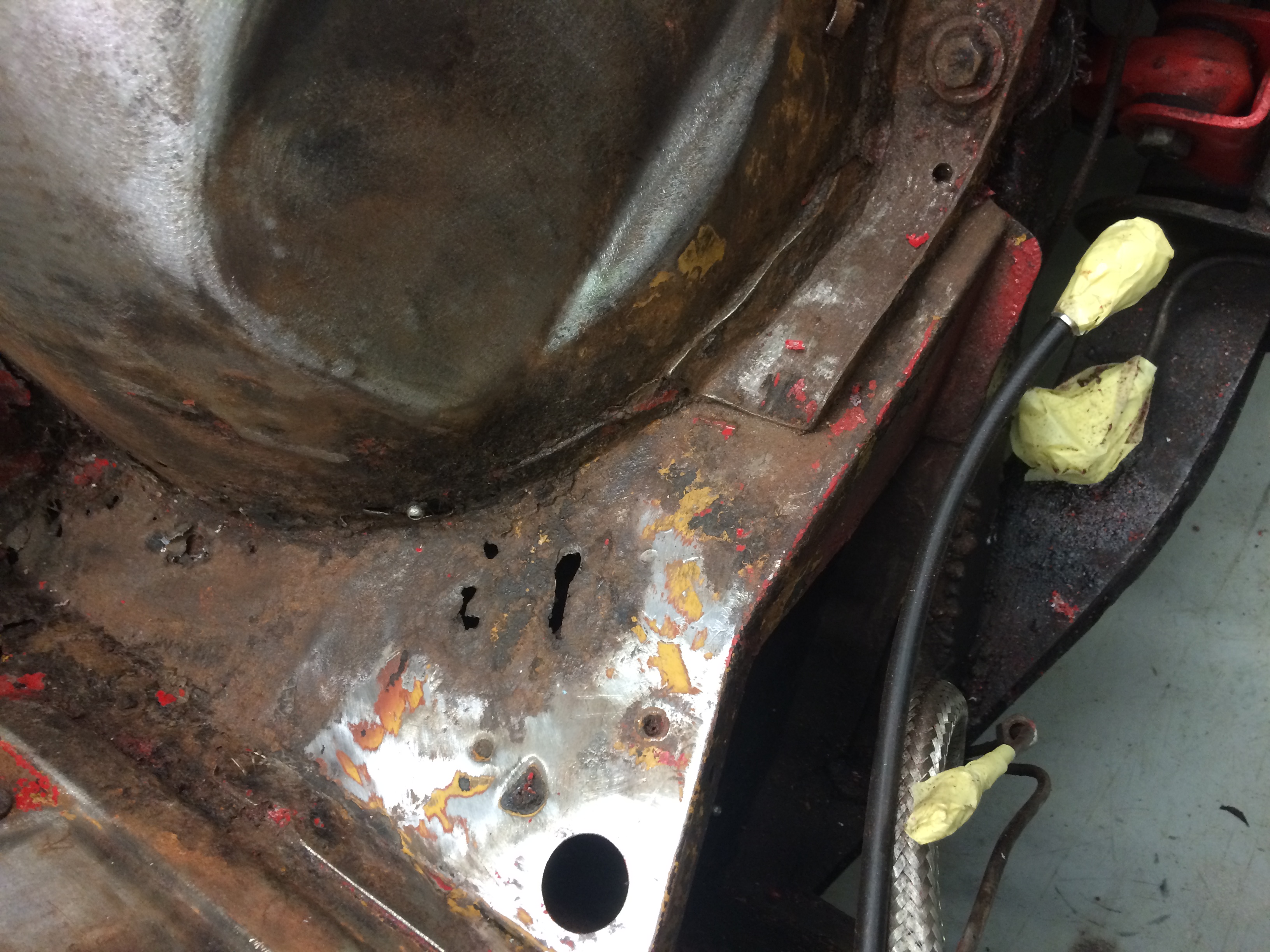 Removed engine, removed paint and media-blast corroded areas. Welding repairs completed prior to complete respray of the engine bay.